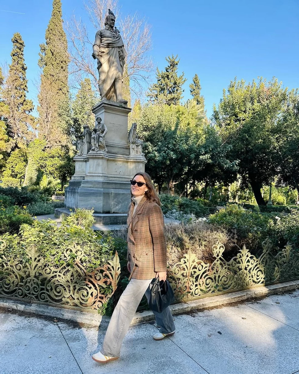 Ειδικότερα, το πρώην μοντέλο επέλεξε ένα καρό blazer σε γήινους τόνους, με σταυρωτό κούμπωμα και το συνδύασε με ένα τζιν παντελόνι σε γκρι τόνους, ιβουάρ ζιβάγκο και τα sneakers που φορούν οι ειδικοί της μόδας.