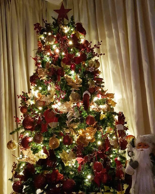 Το χριστουγεννιάτικο δέντρο της Ελένης Μενεγάκη έχει πολλά στολίδια και μπάλες, αλλά και μια κόκκινη κορδέλα. Στη βάση του ξεχωρίζουν οι μεγάλες φιγούρες με τους μάγους να φέρουν τα δώρα.