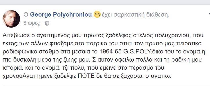 «Aπεβίωσε ο αγαπημένος μου πρώτος ξάδελφος Στέλιος Πολυχρονίου, που εκτός των άλλων φτιάξαμε στο πατρικό του σπίτι τον πρώτο μας πειρατικό ραδιοφωνικό σταθμό στα μεσαία το 1964-65. G.S.POLY. δικό του το όνομα. Η πιο δύσκολη μέρα της ζωής μου. Σε αυτόν οφείλω πολλά και τη ραδ/κη μου ιστορία. Και το όνομα Τζι Πολυ, που έμεινε στο πέρασμα του χρόνου. Αγαπημένε ξάδελφε ΠΟΤΕ δε θα σε ξαχάσω. Σ’ αγαπώ».