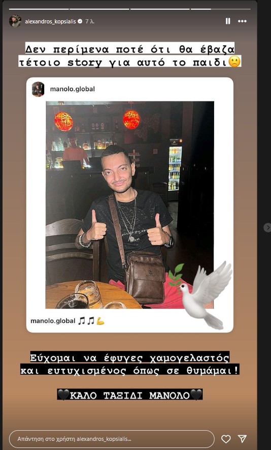 Συγκεκριμένα, ο Αλέξανδρος Κοψιάλης ανέβασε στον προσωπικό του λογαριασμό στο Instagram μια φωτογραφία του Manolo, στην οποία έγραψε: “Δεν περίμενα ποτέ ότι θα έβαζα τέτοιο story γι’ αυτό το παιδί. Εύχομαι να έφυγες χαμογελαστός και ευτυχισμένος όπως σε θυμάμαι. Καλό ταξίδι Μανόλο”.