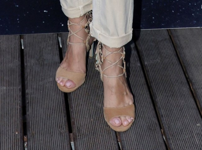 Ενδιαφέρον στοιχείο οι peep toe γόβες της σε nude απόχρωση με κορδόνια και μακραμέ στο πίσω μέρος.
