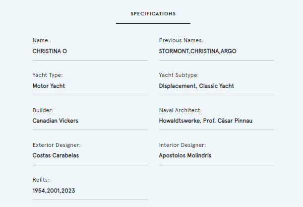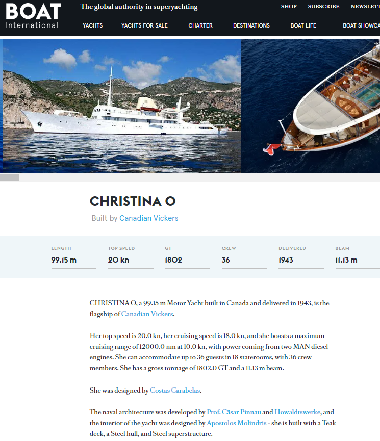 Όπως αναφέρει η αγγελία του μεσίτη η Christina O, ένα Motor Yacht μήκους 99,15 μέτρων που κατασκευάστηκε στον Καναδά και παραδόθηκε το 1943, είναι η ναυαρχίδα της Canadian Vickers.