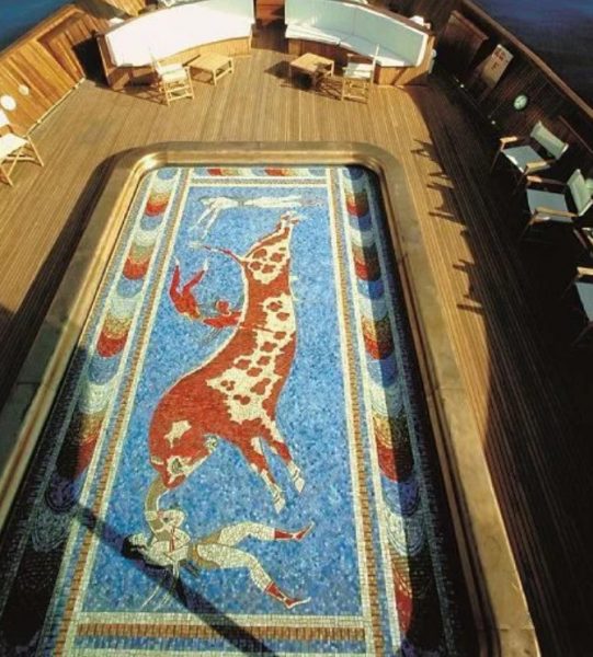 Η βιβλιοθήκη της θαλαμηγού ήταν γεμάτη με έργα Ελλήνων κλασικών συγγραφέων, τα σκαμνιά του μπαρ ήταν καλυμμένα με δέρμα λευκής φάλαινας, ενώ ο πυθμένας της πισίνας υψωνόταν ως το επίπεδο του καταστρώματος και μετατρεπόταν σε πίστα χορού, διακοσμημένη με ψηφιδωτά που απεικόνιζαν σκηνές από την ελληνική μυθολογία.