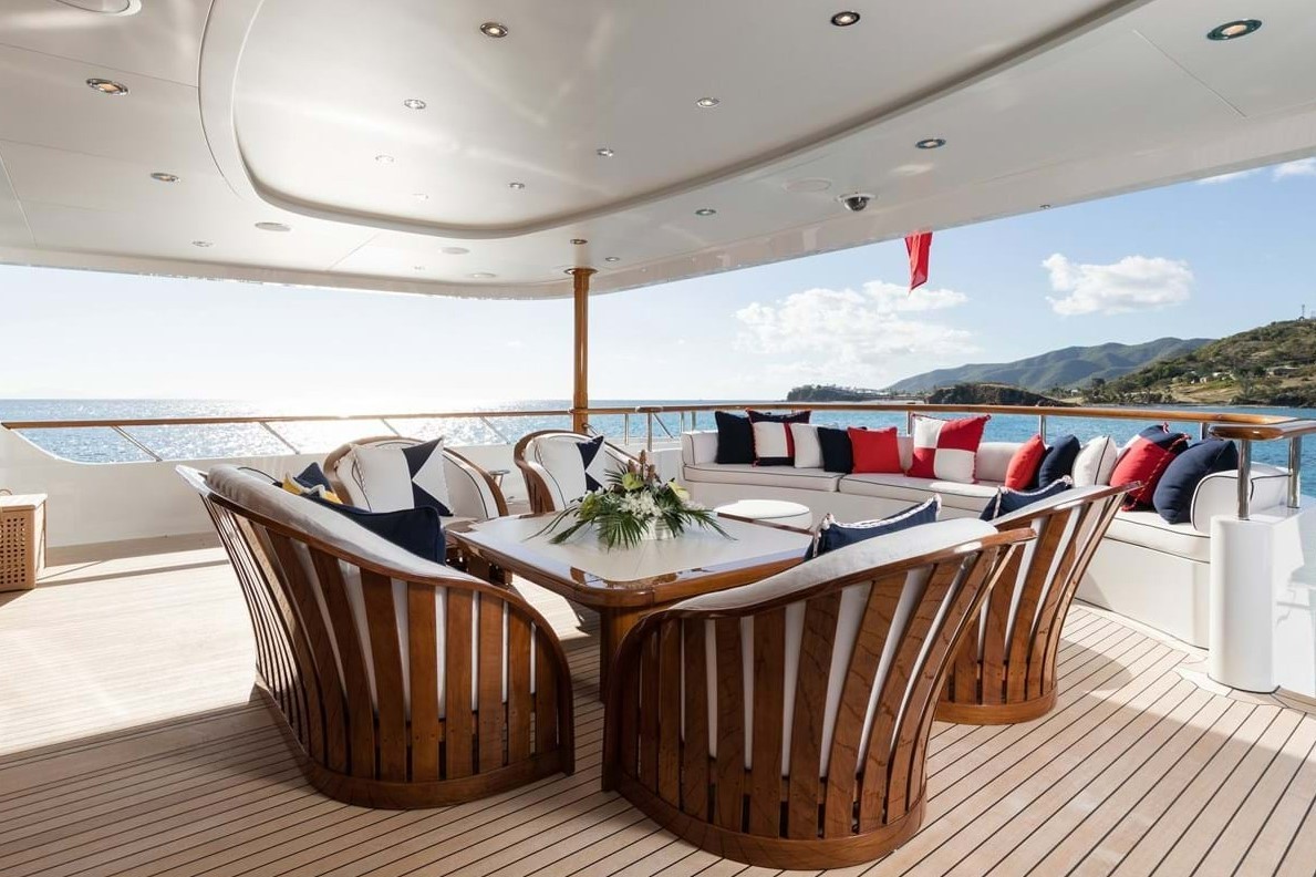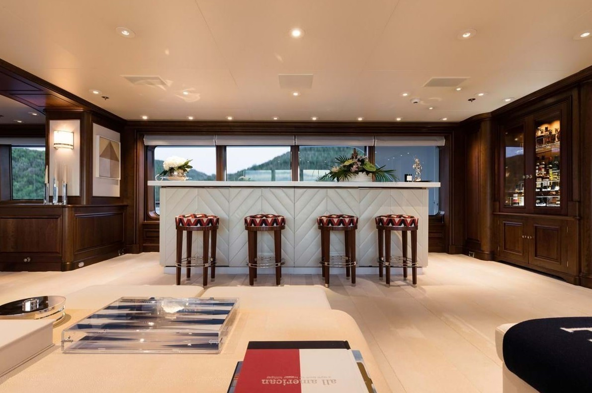 Φτιαγμένο από χάλυβα και αλουμίνιο, το Flag είναι ένα από τα πιο εμβληματικά σχέδια της Feadship. Έχει κομψές εξωτερικές γραμμές και ένα διαχρονικό εσωτερικό που επικρατείται από ξύλινες επενδύσεις, κρεμ βελούδινα χαλιά, δερμάτινα περιτυλίγματα και δάπεδα από φυσική πέτρα.