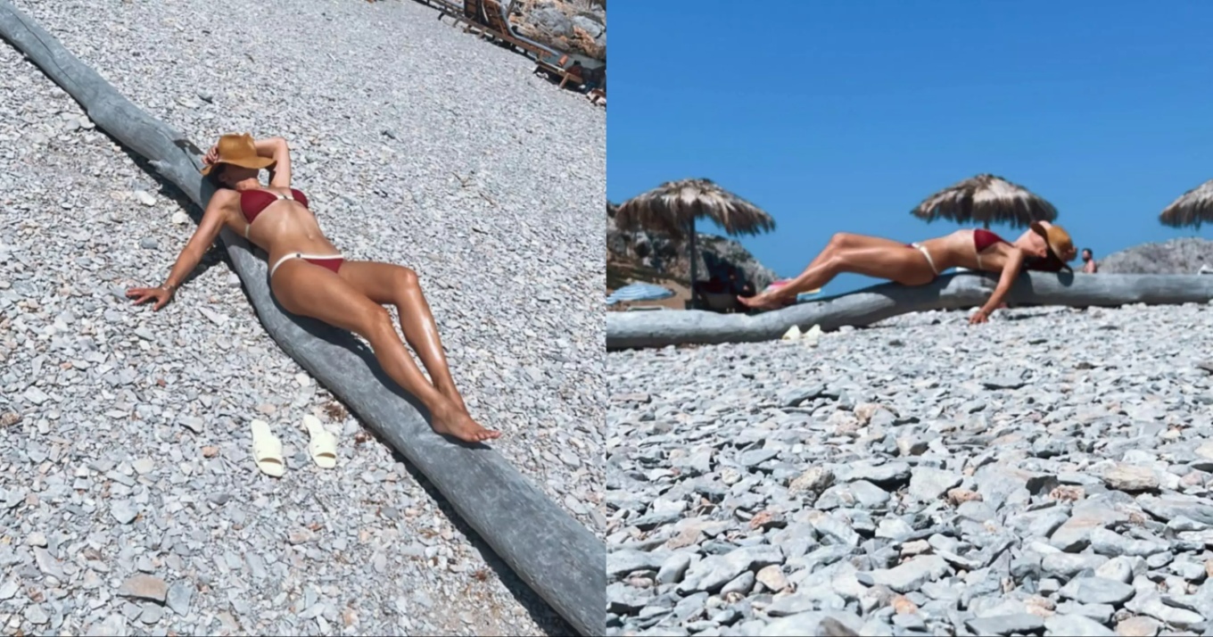 Η παρουσιάστρια πόζαρε ξαπλωμένη σε έναν κορμό δέντρου στη παραλία, φορώντας ένα κόκκινο μπικίνι και ένα ψάθινο καπέλο. Στη λεζάντα της ανάρτησής της, έγραψε: «Αστυπάλαια. Ατελείωτο ελληνικό καλοκαίρι».