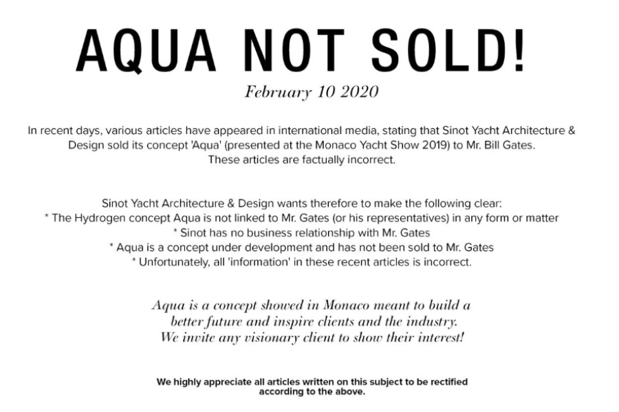 Αφού η “είδηση” έκανε τον κύκλο του διαδικτύου, η εταιρία Sınot προέβη σε διευκρινιστική ανακοίνωση στις 10 Φεβρουαρίου με τίτλο “Aqua Not Sold!” (Το “Άκουα” δεν πουλήθηκε!”), αρνούμενη οποιανδήποτε οικονομική, επιχειρηματική ή εμπορική σχέση με τον Bill Gates ή αντιπροσώπους του, πόσω μάλλον την πώληση του σχεδιασθέντος σκάφους.