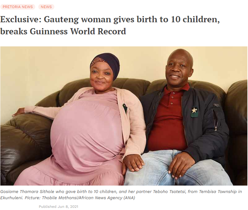 Αρχικά, ο ισχυρισμός ότι η Νοτιοαφρικανή Gosiame Thamara Sithole έφερε στον κόσμο 10 μωρά, σε μία μόνο κύηση, που αποτελεί ένα παγκόσμιο ρεκόρ, δεν αληθεύει. Αφορμή για τους παραπλανητικούς ισχυρισμούς στάθηκε μία συνέντευξη που έδωσαν οι γονείς, που έχουν ήδη δίδυμα ηλικίας έξι ετών, στο τοπικό μέσο, Pretotia News, στις 8 Ιουνίου 2021. Το Pretoria News δημοσίευσε την είδηση ότι η μητέρα γέννησε 10 μωρά, επικαλούμενο τους γονείς ως πηγή.