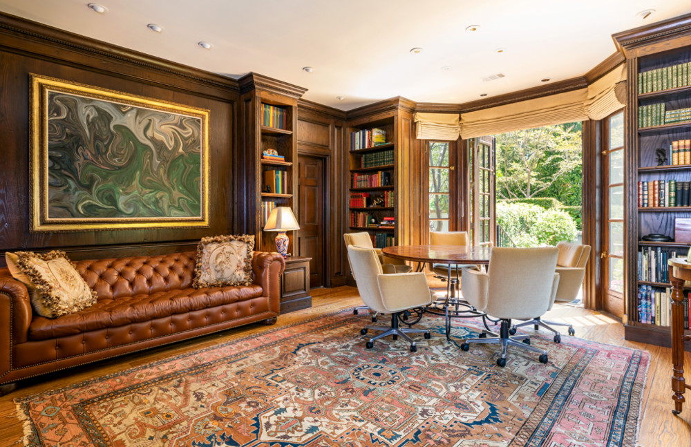 Γραφείο, με ξύλινη διακόσμηση, δερμάτινο καναπέ και εντυπωσιακό πίνακα.