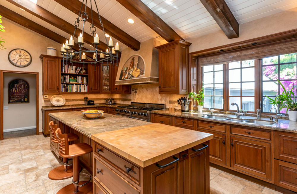 Κουζίνα, με γρανιτένιους πάγκους και επικλινή οροφή, με τα ορατά δοκάρια.