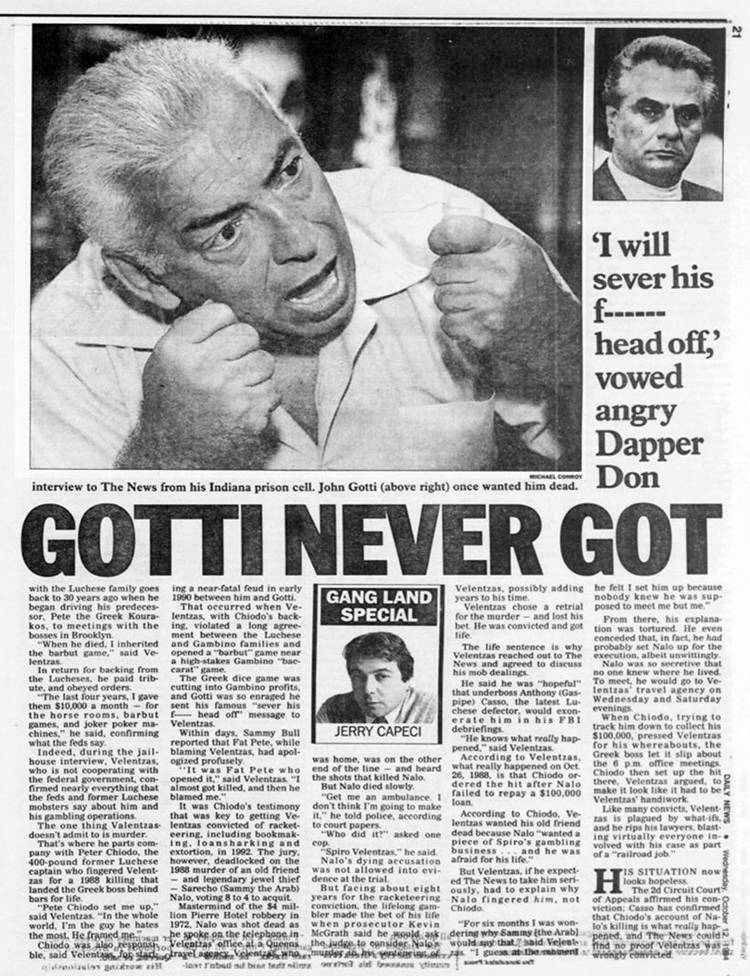 Την ώρα όμως που το συνεταιράκι του John Gotti δεν άνοιξε ποτέ το στόμα του μέσα από το κελί του στις φυλακές του Ιλινόις, καμιά 300αριά χιλιόμετρα μακριά, σε σωφρονιστικό κατάστημα της Ιντιάνα, ο Βελέντζας άρχισε να «κελαηδά» το 1994. Σε ποιον άλλο, τον Jerry Capeci!