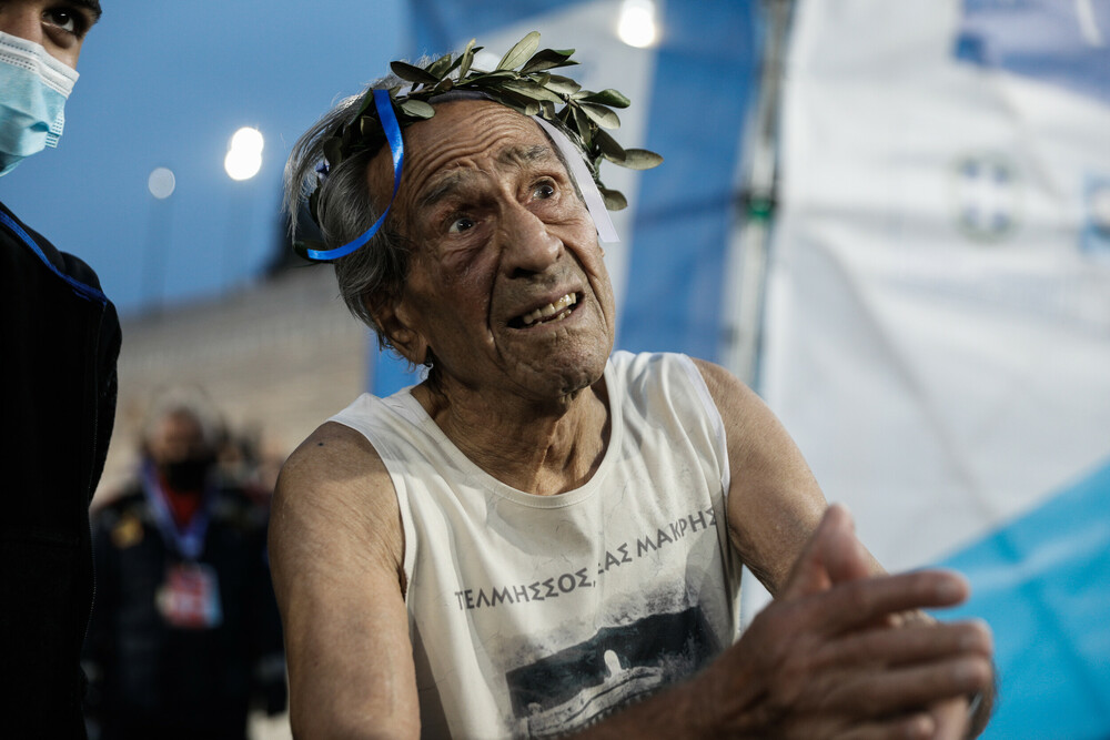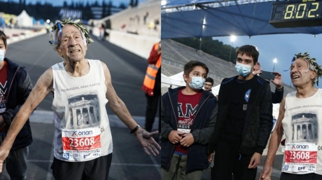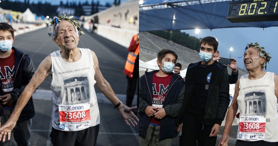 Ο κ. Στέλιος κατάφερε και τερμάτισε στον μαραθώνιο σε οχτώ ώρες και τον αγκάλιασαν τα εγγόνια του, σε μία ιδιαίτερα συγκινητική στιγμή, ενώ η πρόεδρος του ΣΕΓΑΣ Σοφία Σακοράφα του έβαλε ένα στεφάνι από κλαδιά ελιάς στο κεφάλι.