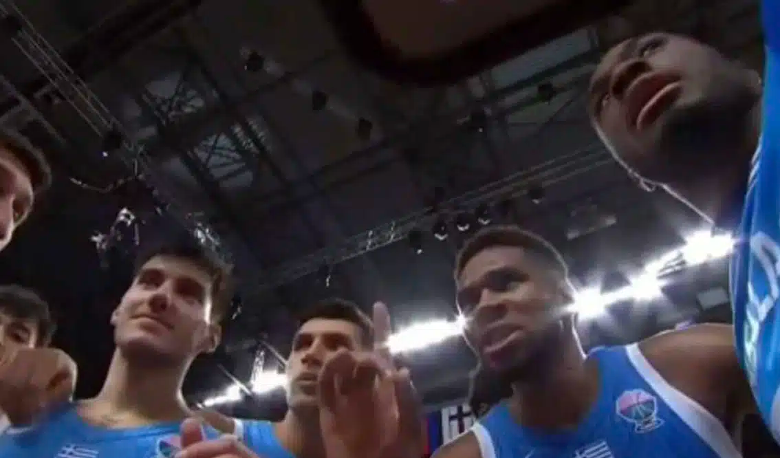 Αμέσως μετά τη λήξη της αναμέτρησης, οι παίκτες της Εθνικής μαζεύτηκαν στο κέντρο του γηπέδου για να πανηγυρίσουν την πρόκριση. Εκεί, παρά τον πανηγυρικό τόνο της στιγμής, ο Γιάννης Αντετοκούνμπο με συγκλονιστική ψυχραιμία τους απηύθυνε μία ομιλία: