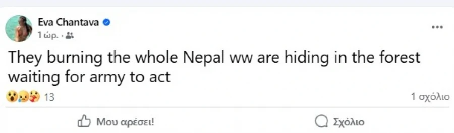 Λίγο αργότερα με νέα ανάρτηση η αθλήτρια έκανε γνωστό ότι κρύβεται σε δασική περιοχή: «Καίνε ολόκληρο το Νεπάλ, εμείς κρυβόμαστε στο δάσος περιμένοντας να δράσει ο στρατός».