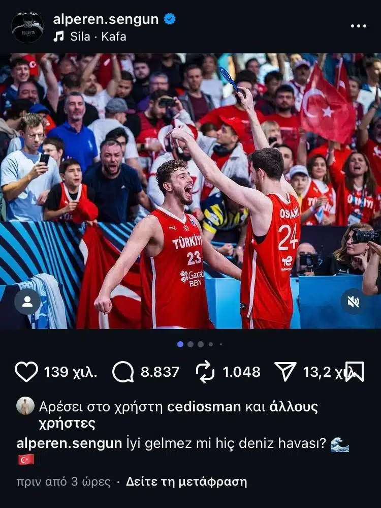 Ο σταρ των Χιούστον Ρόκετς επέλεξε να γιορτάσει την πρόκριση στον τελικό με αναρτήσεις που προκάλεσαν έντονες αντιδράσεις. Σε μία από αυτές, χρησιμοποίησε επεξεργασμένη φωτογραφία στην οποία εμφανίζεται με τους συμπαίκτες του μαζί με τον Κεμάλ Ατατούρκ, προσωπικότητα υπεύθυνη για τον θάνατο χιλιάδων Ελλήνων κατά τη Μικρασιατική Καταστροφή.