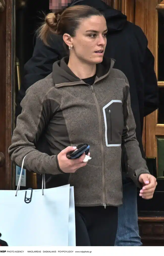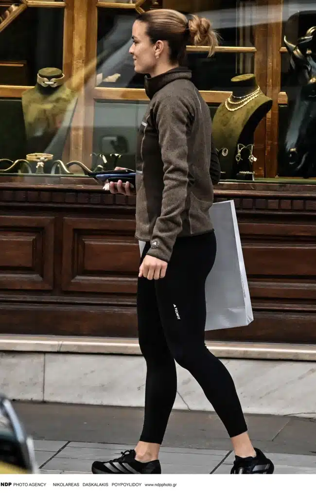 Η διεθνούς φήμης Ελληνίδα τενίστρια για την εξόρμησή της, δημιούργησε ένα αθλητικό look που απαρτιζόταν από ένα μαύρο αθλητικό κολάν, ασορτί σνίκερς και μία καφέ φλις καφέ μπλούζα.