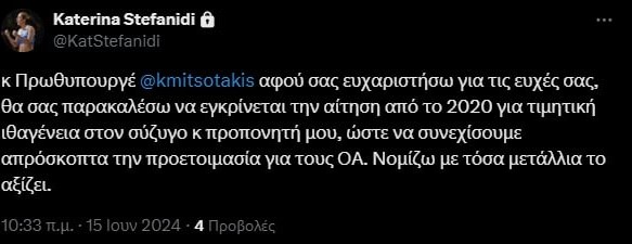 «Κύριε Πρωθυπουργέ αφού σας ευχαριστήσω για τις ευχές σας, θα σας παρακαλέσω να εγκρίνεται την αίτηση από το 2020 για τιμητική ιθαγένεια στον σύζυγο κ προπονητή μου, ώστε να συνεχίσουμε απρόσκοπτα την προετοιμασία για τους ΟΑ. Νομίζω με τόσα μετάλλια το αξίζει» έγραψε συγκεκριμένα στο Twitter η Ελληνίδα πρωταθλήτρια.