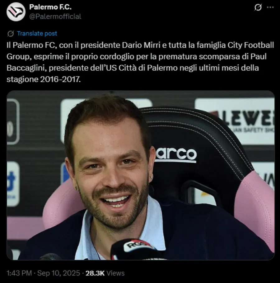 «Η Παλέρμο, μαζί με τον πρόεδρο Ντάριο Μίρι και ολόκληρη την οικογένεια του City Football Group, εκφράζουν τα συλλυπητήριά τους για τον πρόωρο θάνατο του Πολ Μπακαλίνι, προέδρου της Παλέρμο κατά τους τελευταίους μήνες της σεζόν 2016-17».