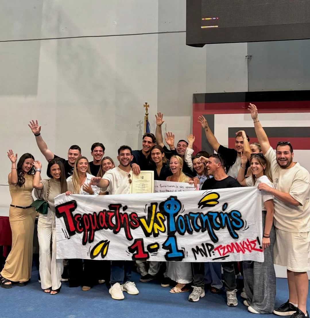 Η οικογένεια και οι φίλοι του βρέθηκαν στο πλευρό του για να τον στηρίξουν σε αυτή τη σημαντική στιγμή, ενώ δεν έλειψαν και τα χιουμοριστικά πανό με μηνύματα όπως “MVP Τζολάκης” και “Τερματζής vs Φοιτητής 1-1”.
