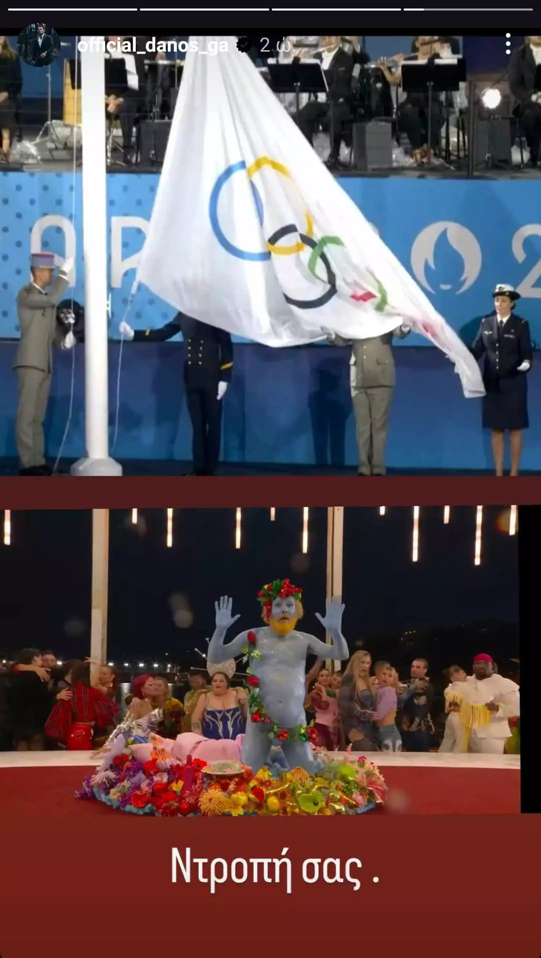 Η Δήμητρα Βαμβακούση, μάλιστα, δεν περιορίστηκε μόνο σε γραπτές δηλώσεις. Δημοσίευσε επίσης ένα βίντεο, στο οποίο ξέσπασε εναντίον της Τελετής Έναρξης, εκφράζοντας την έντονη απογοήτευσή της για τα «δρώμενα» που παρακολούθησαν. «Τι σχέση έχει η θρησκεία με το αθλητικό ιδεώδες; Πώς συνδέεται; Γιατί και τότε, αν το πάρουμε από την αρχή, πιστεύαν στο Δωδεκάθεο. Υπήρχε εκεχειρία και ακόμη και αυτοί που ήταν καταδικασμένοι σε θάνατο, έπαυε αυτό μέχρι να τελειώσουν οι Ολυμπιακοί Αγώνες. Τόσο μεγάλο ήταν τότε στο μυαλό τους. Και τώρα το έχουν ξεφτιλίσει, με τον Διόνυσο μπροστά, πάνω στο τραπέζι και πίσω να γίνονται τύπου όργια. Προφανώς είναι σαν να είναι ο μυστικός δείπνος. Δεν έχω να πω τίποτα άλλο, πέρα το ότι είναι ντροπή για την αρχή των Ολυμπιακών Αγώνων, για τη διοργάνωση του Παρισιού».