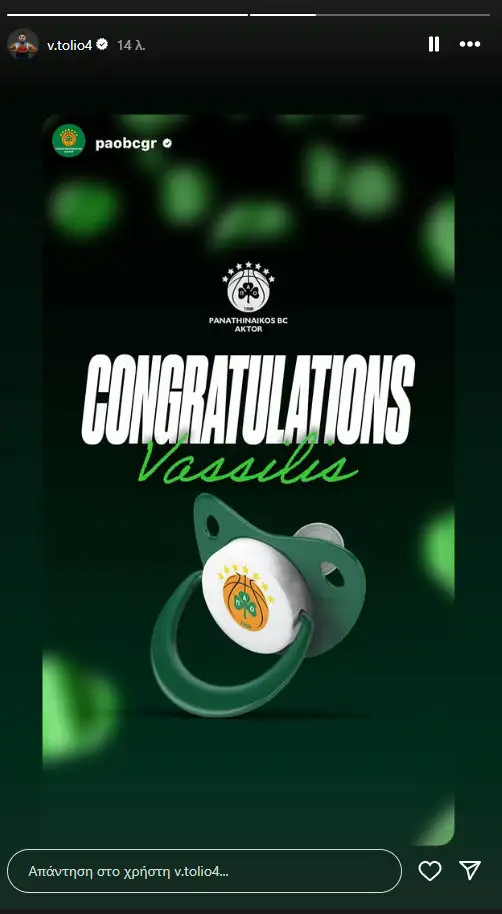 Το απόγευμα της Παρασκευής 27 Ιουνίου ο Βασίλης Τολιόπουλος μέσα από τις αναδημοσιεύσεις στο instagram ενημέρωσε πως έγινε πατέρας! Η σύντροφός του έφερε στον κόσμο τον γιο τους, ενώ ευχές στην οικογένεια έστειλε και η ομάδα του Παναθηναϊκού μέσα από σχετική ανάρτηση.