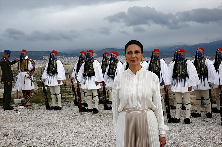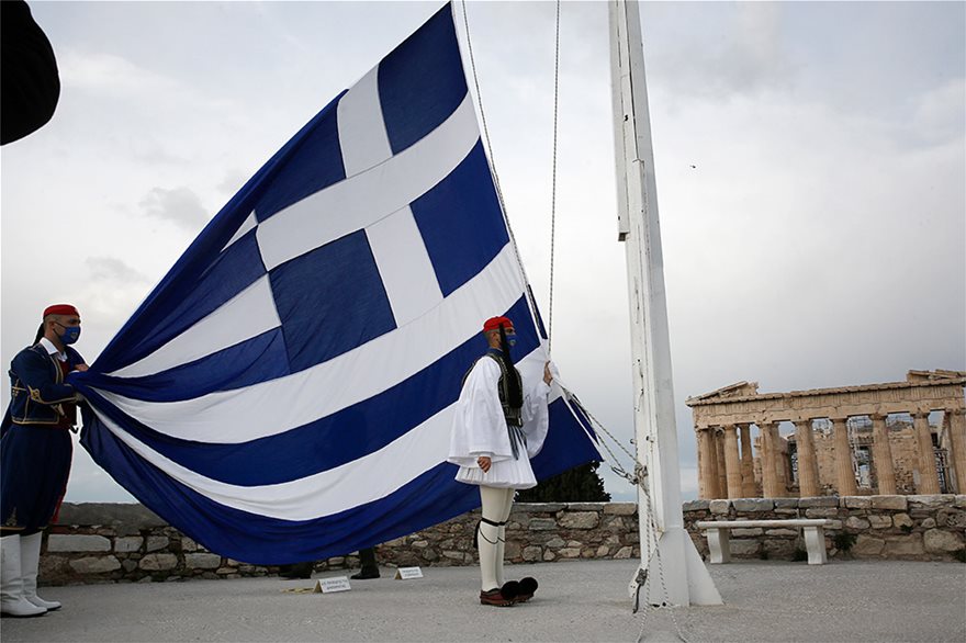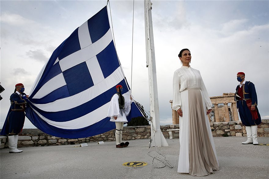Παρουσία της Προέδρου της Δημοκρατίας, Κατερίνας Σακελλαροπούλου και του πρωθυπουργού Κυριάκου Μητσοτάκη πραγματοποιήθηκε στις 08:00 η τελετή της επίσημης έπαρσης της σημαίας στον Ιερό Βράχο της Ακρόπολης. Τον εθνικό ύμνο έψαλλε η διεθνούς φήμης σοπράνο Αναστασία Ζαννή.