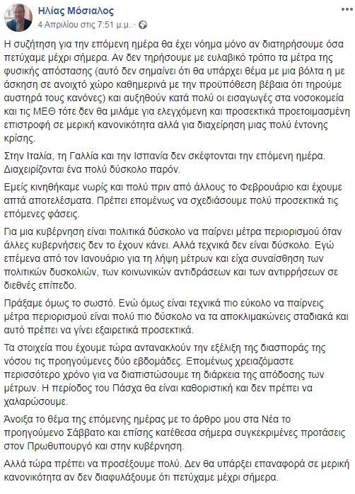 «H συζήτηση για την επόμενη ημέρα θα έχει νόημα μόνο αν διατηρήσουμε όσα πετύχαμε μέχρι σήμερα. Αν δεν τηρήσουμε με ευλαβικό τρόπο τα μέτρα της φυσικής απόστασης (αυτό δεν σημαίνει ότι θα υπάρχει θέμα με μια βόλτα η με άσκηση σε ανοιχτό χώρο καθημερινά με την προϋπόθεση βέβαια ότι τηρούμε αυστηρά τους κανόνες) και αυξηθούν κατά πολύ οι εισαγωγές στα νοσοκομεία και τις ΜΕΘ τότε δεν θα μιλάμε για ελεγχόμενη και προσεκτικά προετοιμασμένη επιστροφή σε μερική κανονικότητα αλλά για διαχείρηση μιας πολύ έντονης κρίσης.