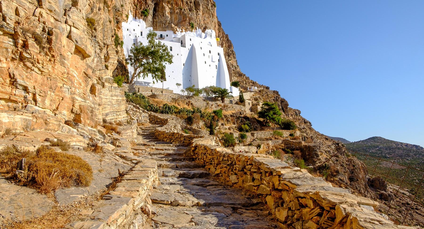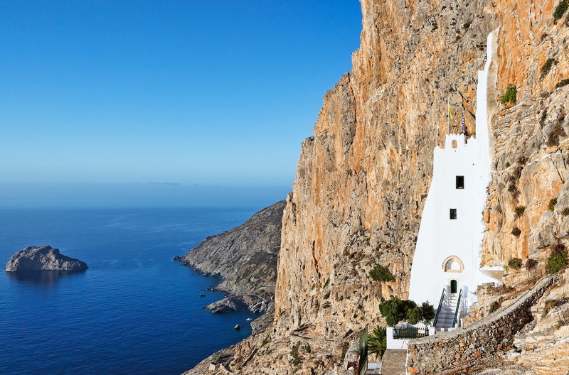 Το σημαντικότερο εκκλησιαστικό μνημείο της Αμοργού, αλλά κι ένα από τα ωραιότερα αξιοθέατα της Ελλάδας, η λαξευμένη στο βράχο Μονή της Χοζοβιώτισσας είναι χτισμένη σε ένα σημείο απόκοσμο μα και απίστευτα όμορφο, στην απόκρημνη νότια ακτή του νησιού. Ορατή μόνο από το πέλαγος, μοιάζει να κρέμεται στον γκρεμό. Τριακόσια μέτρα πάνω από τη θάλασσα, τα απότομα βράχια εναρμονίζονται άψογα με τους λευκούς γεωμετρικούς όγκους του κτίσματος. Για να φτάσετε στο μοναστήρι θα πρέπει να ανεβείτε περίπου 300 σκαλιά. Οι μοναχοί θα σας τρατάρουν λουκούμι και παγωμένο νερό.