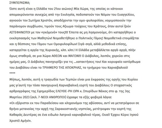 Συγκεκριμένα σε μακροσκελές κείμενό του στο ekklisiaonline.gr αναφέρει «θα πρέπει, συνεπώς, να διερευνήσουμε μήπως τα διάφορα αυτά έκτακτα και καταστροφικά σοβαρά γεγονότα, τα οποία τώρα τελευταία συμβαίνουν σ’ ολόκληρο τον Πλανήτη μας (όπως οι σεισμοί, οι καταποντισμοί, οι πλημμύρες, οι πυρκαϊές κλπ.), μήπως εκφράζουν την οργήν του Θεού για την αποστασία του σημερινού ανθρώπου από τον δρόμο της αρετής, από την αγκαλιά του Θεού; Προκειμένου δε περί του τραγικού συμβάντος εκεί ψηλά στα Τέμπη της Θεσσαλίας μήπως το γεγονός αυτό έρχεται ως ΤΙΜΩΡΙΑ από τον Θεόν για την υπερβολική ασέβεια του ανθρώπου και τον πλεονασμό της αμαρτίας κατά το προηγηθέν τριήμερο του Καρναβαλιού, που τόσο πολύ γιορτάσθηκε όχι μόνον σ’ ολόκληρη σχεδόν την Ελλάδα, αλλά και σε διάφορες άλλες περιοχές του Πλανήτου μας;».