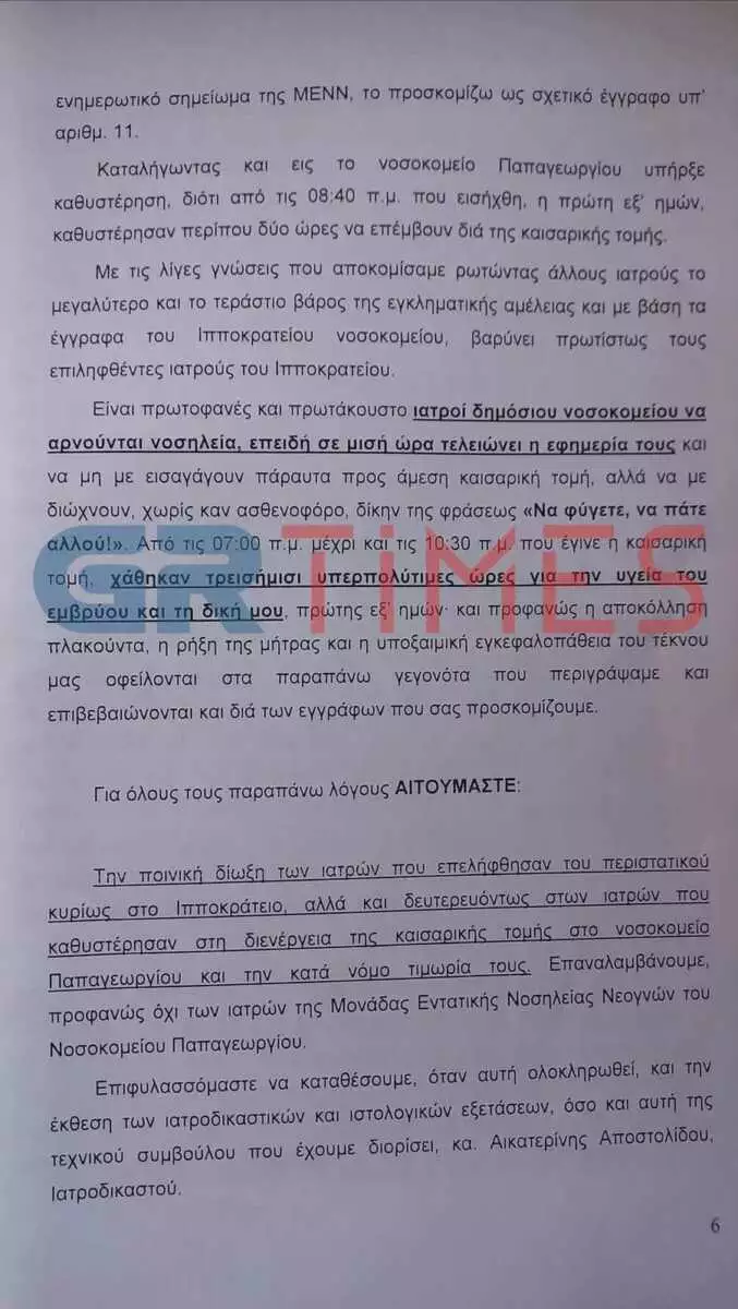 «Στο νοσοκομείο Παπαγεωργίου με εισήγαγαν αρχικώς περί τις 8.40 π.μ., αντί σε γυναικολογική κλινική για να γεννήσω, σε Covid -19 κλινική στο Τμήμα Επειγόντων Περιστατικών (ΤΕΠ) και μια ώρα μετά, ήτοι στις 9.40 π.μ., της ίδιας ημέρας, με εισήγαγαν στη μαιευτική κλινική για επείγουσα, άμεση χειρουργική επέμβαση καισαρικής τομής, όπου και τελικώς μια ώρα μετά, ήτοι στις 10.30 π.μ. γέννησα με καισαρική τομή ένα άσφυγμο, άρρεν, ώριμο νεογνό υπό ισχιακή προβολή, έχοντας ήδη υποστεί εκ της εγκληματικής αρνήσεως, αλλά και της καθυστερήσεως των δύο νοσοκομείων, αποκόλληση πλακούντα και ρήξη μήτρας» συμπληρώνει η μητέρα.