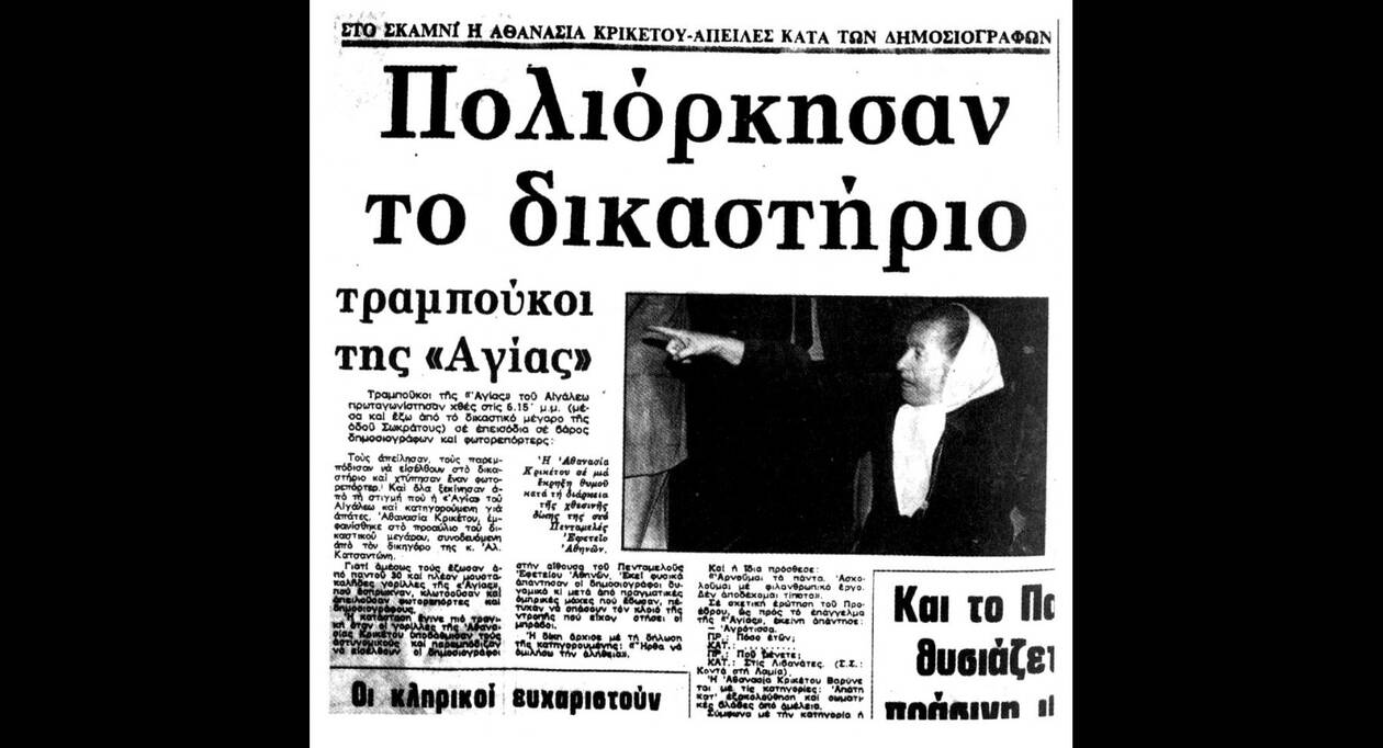 Από το 1967 είχε αφοριστεί από την Εκκλησία της Ελλάδος με απόφαση της Ιεράς Συνόδου και αποκαταστάθηκε το 1980. Αρκετές φορές πέρασε από δικαστήρια λόγω των κατηγοριών που της απαγγέλθηκαν, αλλά ουδέποτε καταδικάσθηκε. Συνήγορος υπεράσπισής της σε όλες τις δίκες ήταν ο ποινικολόγος Γιάννης Παπαδογιαννάκης, ο οποίος διατέλεσε γενικός γραμματέας του Υπουργείου Δικαιοσύνης επί κυβέρνησης Ανδρέα Παπανδρέου και γενικός γραμματέας της Ελληνικής Εταιρείας Ποινικού Δικαίου.