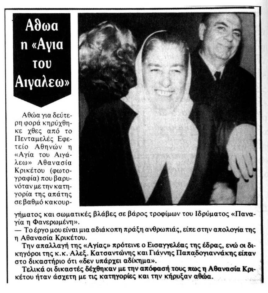 Αγία Αθανασία του Αιγάλεω: Δεν βρίσκεται πλέον στη ζωή, η «Αγία» από το Αιγάλεω. Η ίδια έφυγε από τη ζωή σε ηλικία 92 ετών. Το πλήρες όνομά της είναι Αθανασία Κρικέτου Σάμαρη. Η κηδεία της πραγματοποιήθηκε, το περασμένο Σάββατο στο ίδρυμα-γηροκομείο «Παναγία Φανερωμένη».