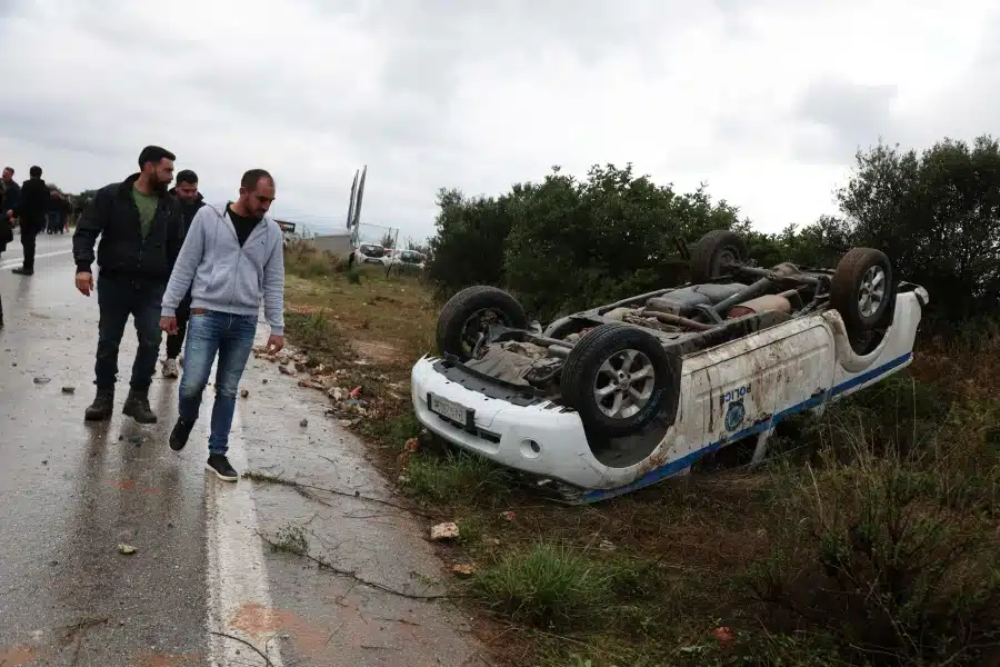 Επίσης οι αγρότες αναποδογύρισαν περιπολικό.