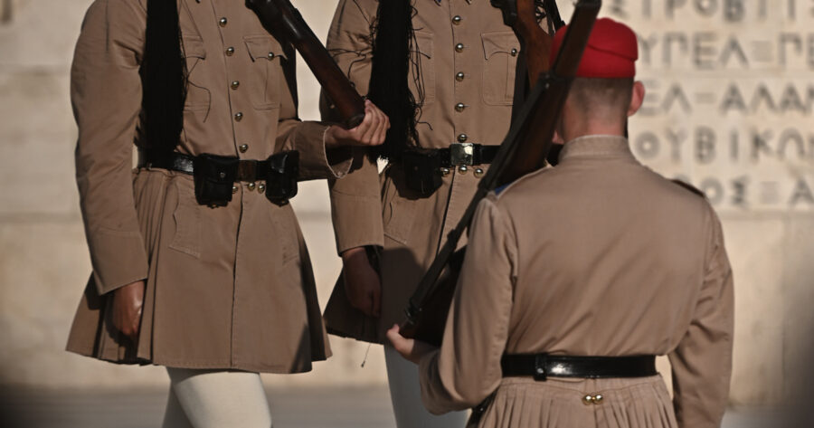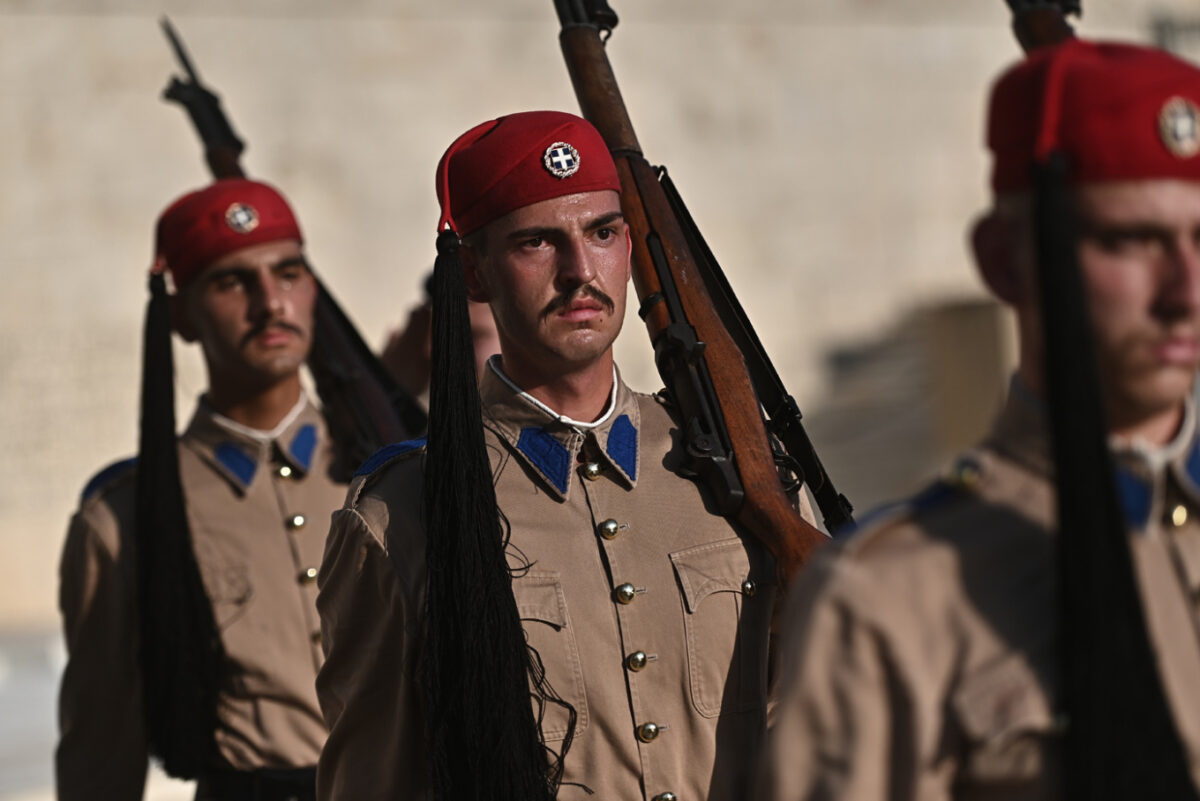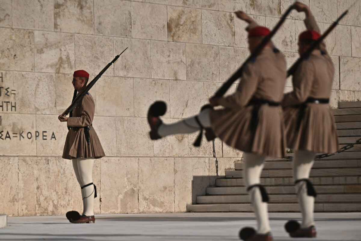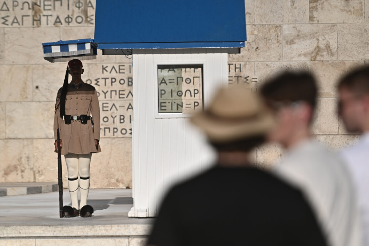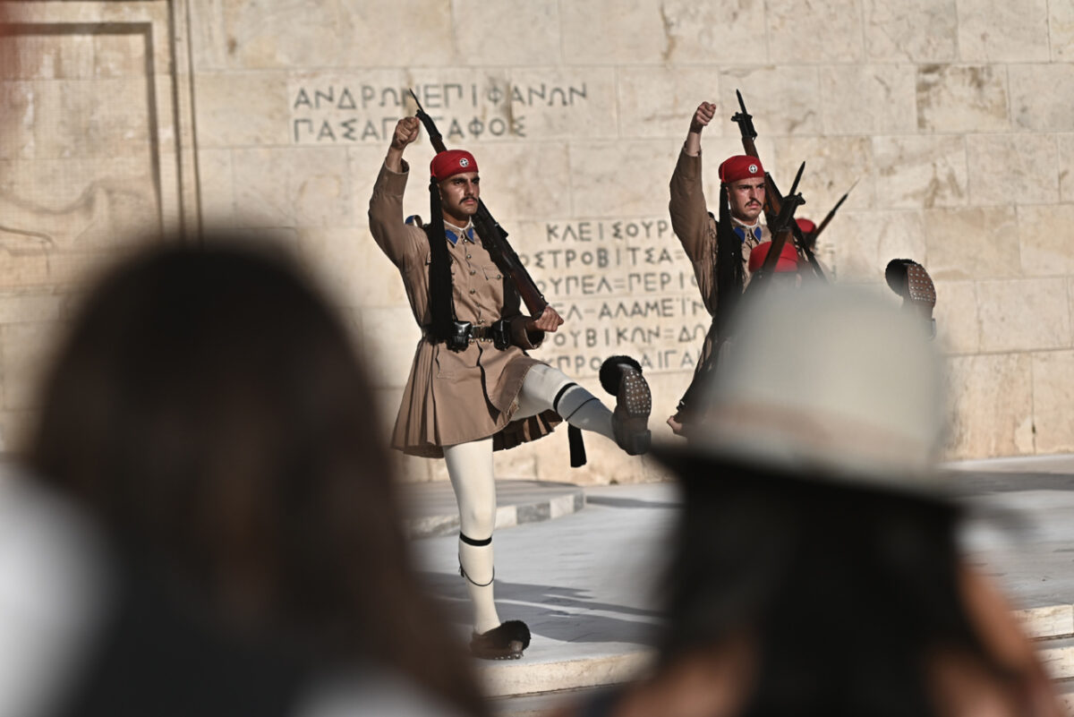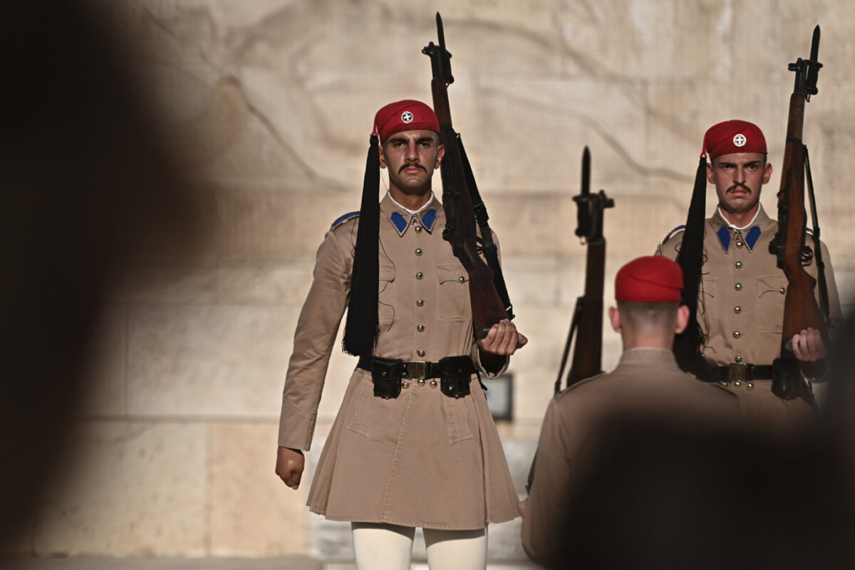 Οι Εύζωνες βαδίζουν γύρω από το μνημείο του Αγνώστου στρατιώτη ή παραμένουν ακίνητοι στις θέσεις τους, φορώντας τη θερινή στολή τους, όπως φαίνεται στα βίντεο και τις φωτογραφίες.