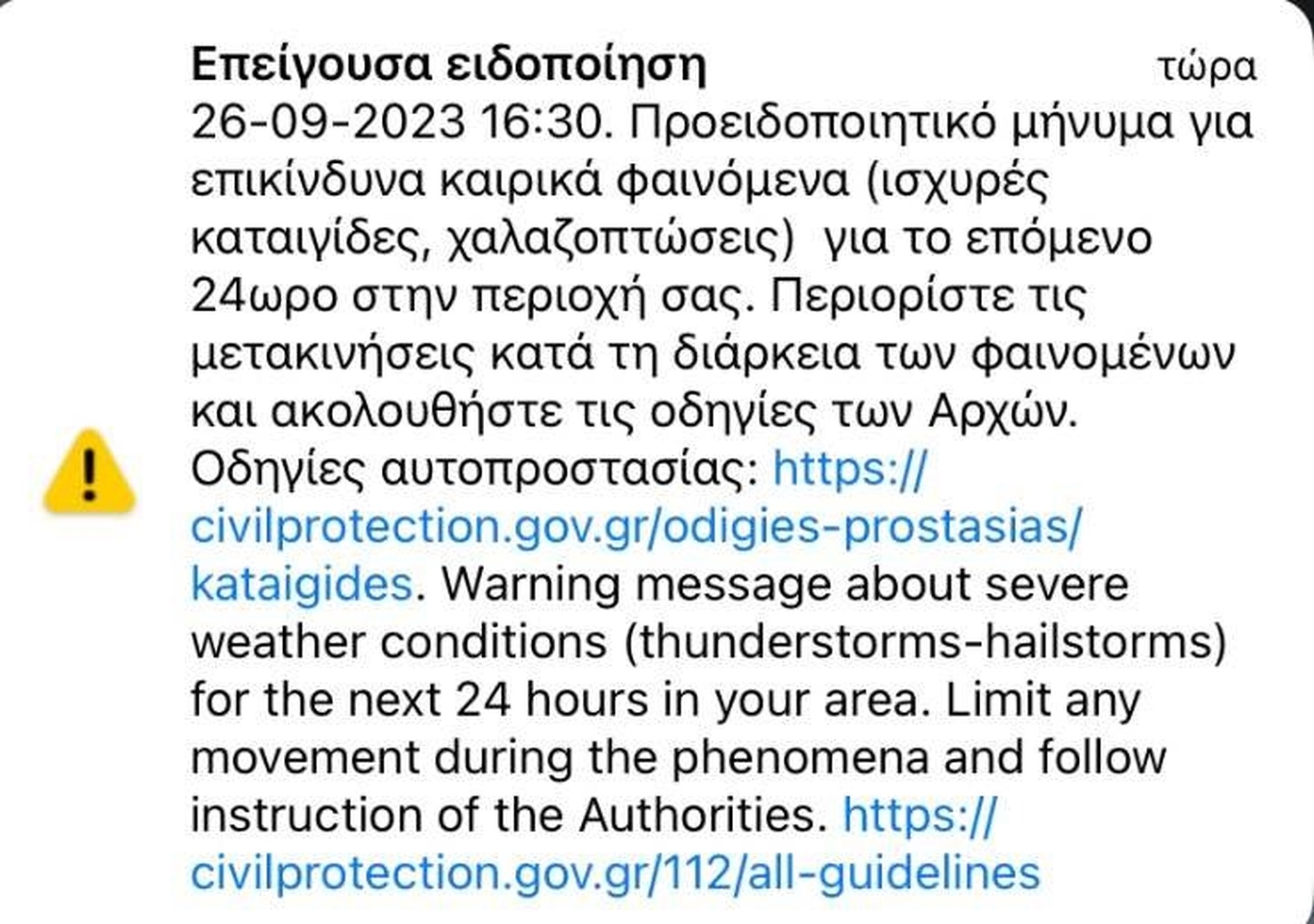 “SOS. Προειδοποιητικό μήνυμα για επικίνδυνα καιρικά φαινόμενα (ισχυρές καταιγίδες, χαλαζοπτώσεις) από τις βραδινές ώρες της 26/9 στην περιοχή σας. Περιορίστε τις μετακινήσεις κατά τη διάρκεια των φαινομένων & ακολουθείτε τις οδηγίες των Αρχών”.