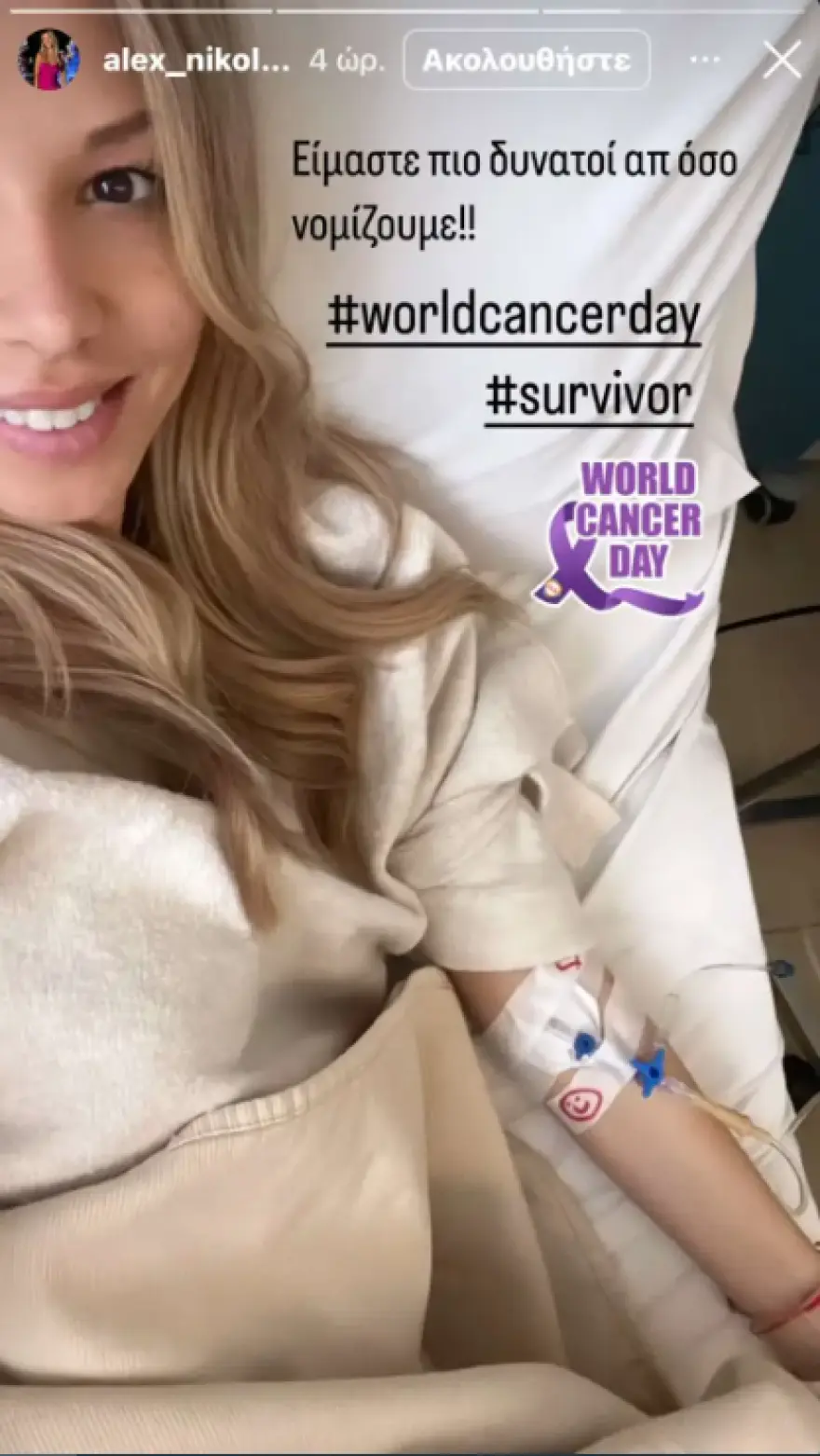 Συγκεκριμένα, η Αλεξάνδρα Νικολαΐδου ανάρτησε ένα στιγμιότυπο με την ίδια να κοιτά χαμογελώντας τον φακό, ενώ είναι ξαπλωμένη στο κρεβάτι του νοσοκομείου. Πάνω στη φωτογραφία έγραψε: «Είμαστε πιο δυνατοί απ’ όσο νομίζουμε», στέλνοντας έτσι το δικό της μήνυμα με αφορμή τη σημερινή ημέρα.
