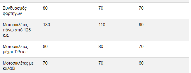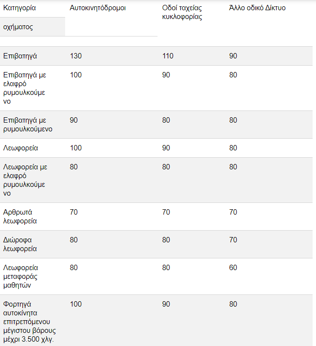 – Εκτός κατοικημένων περιοχών τα ανώτατα επιτρεπόμενα όρια ταχύτητας, για τις διάφορες κατηγορίες αυτοκίνητων οχημάτων και των συνδυασμών αυτών, ορίζονται παρακάτω.
