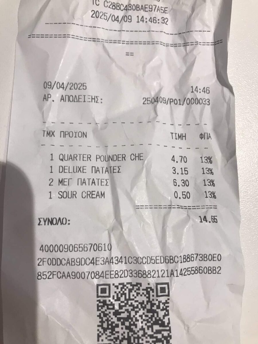 Το Burger αγοράστηκε σήμερα στις 14:46 από κατάστημα της αλυσίδας McDonald’s στο Χαλάνδρι: