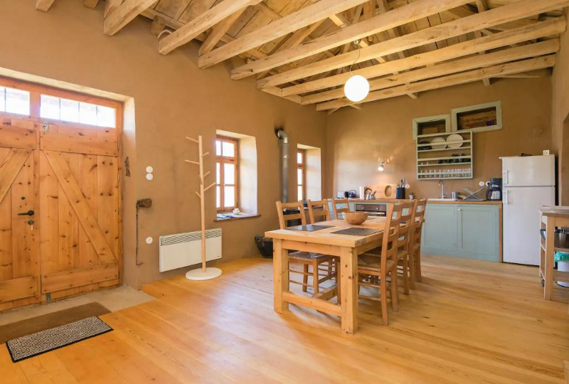 Η κουζίνα του σπιτιού είναι σωστά εξοπλισμένη. Σχετικά με αυτό που ξεχωρίζει, αυτό δεν είναι άλλο φυσικά από το ξύλινο τραπέζι.