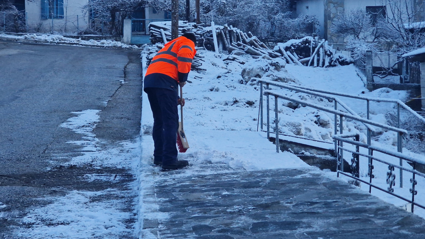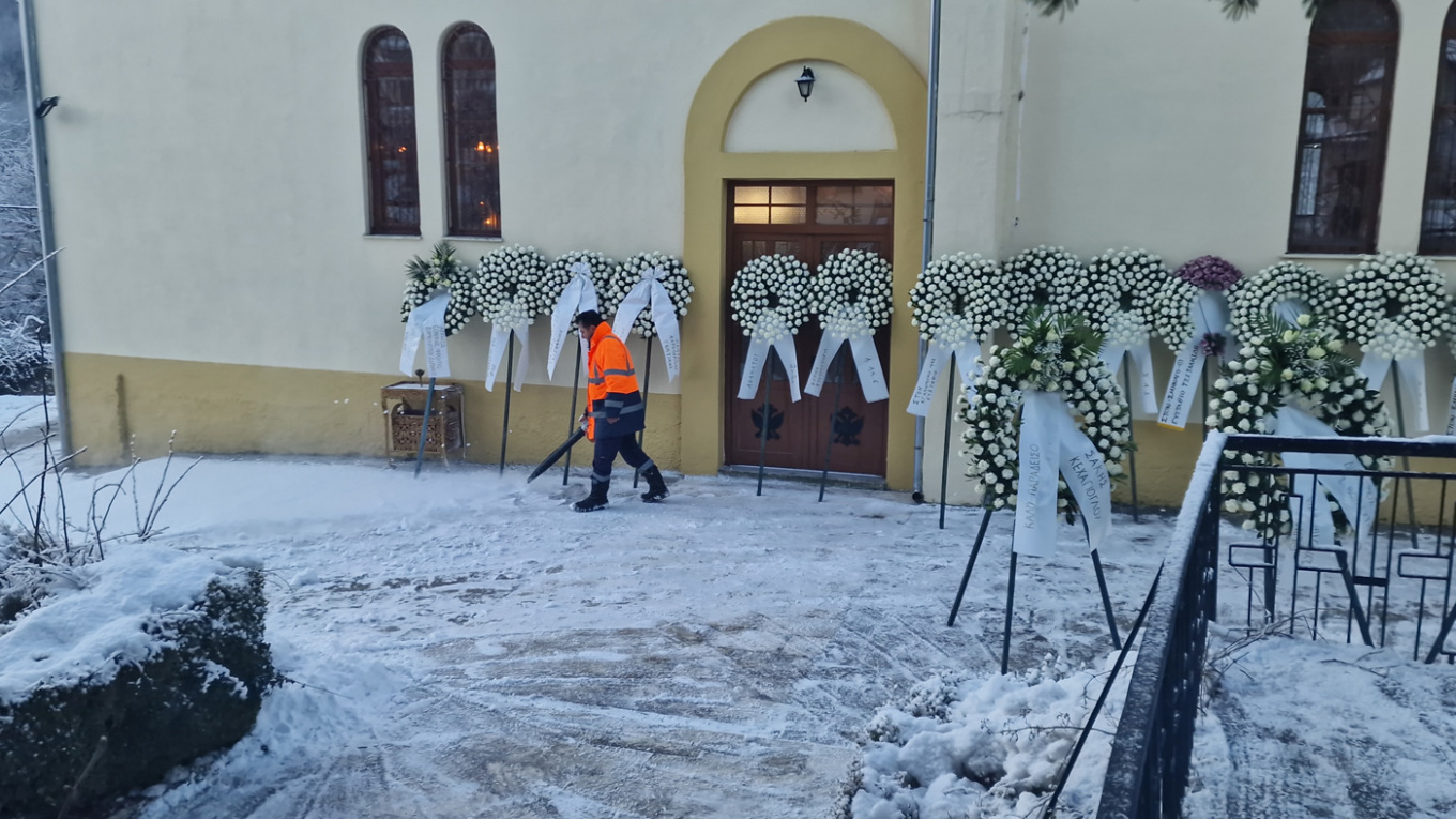 Εργαζόμενοι του Δήμου βρέθηκαν από νωρίς στην εκκλησία για να καθαρίσουν το χιόνι πριν τη μεταφορά της σορού και την άφιξη του κόσμου.