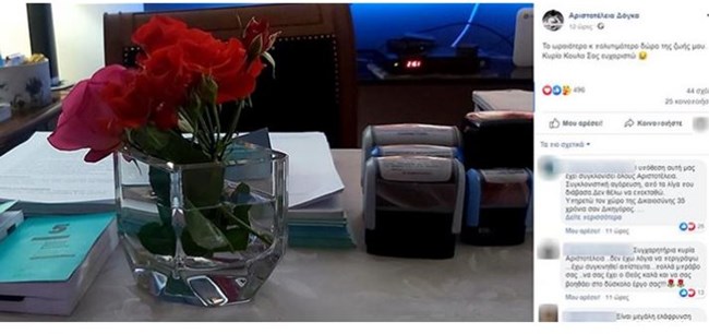 Η Εισαγγελέας ανάρτησε στην προσωπική της σελίδα στο Facebook τη φωτογραφία με τα κόκκινα τριαντάφυλλα, τα οποία τοποθέτησε σε βάζο πάνω στο γραφείο της. “Το ωραιότερο και πολυτιμότερο δώρο της ζωής μου. Κυρία Κούλα… Σας ευχαριστώ”, έγραψε η κ. Δόγκα.