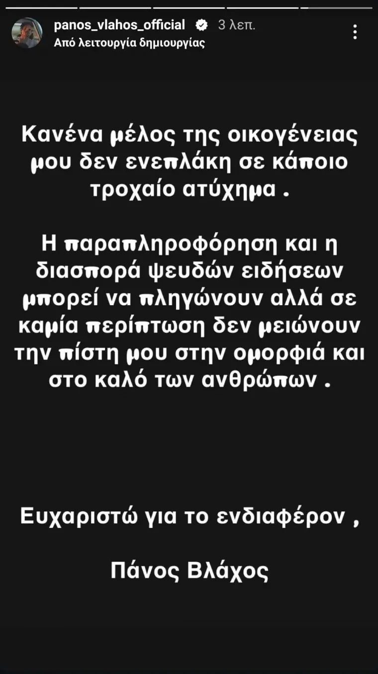 «Κανένα μέλος της οικογένειας μου δεν ενεπλάκη σε κάποιο τροχαίο ατύχημα. Η παραπληροφόρηση και η διασπορά ψευδών ειδήσεων μπορεί να πληγώνουν αλλά σε καμία περίπτωση δεν μειώνουν την πίστη μου στην ομορφιά και στο καλό των ανθρώπων. Ευχαριστώ για το ενδιαφέρον, Πάνος Βλάχος» έγραψε ο ηθοποιός και τραγουδιστής.