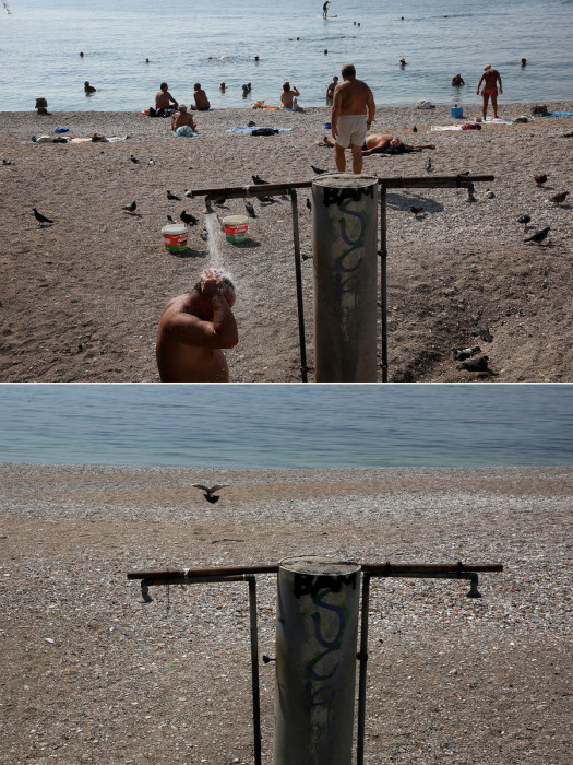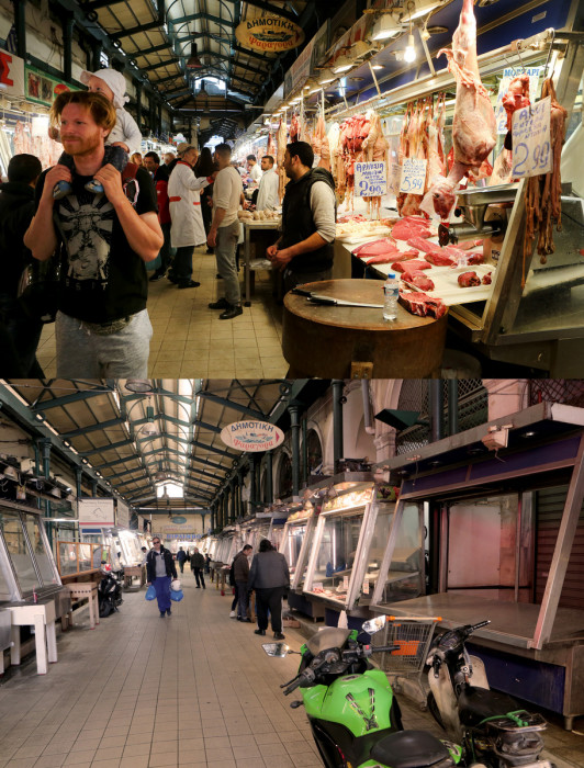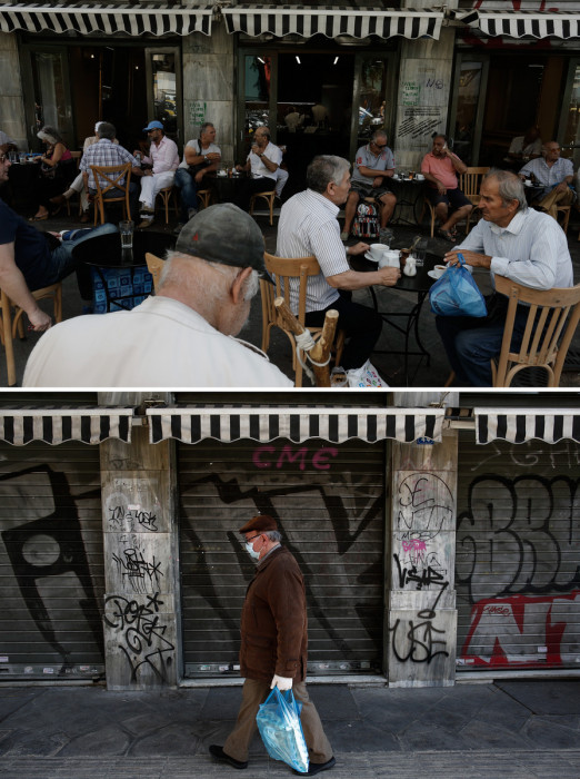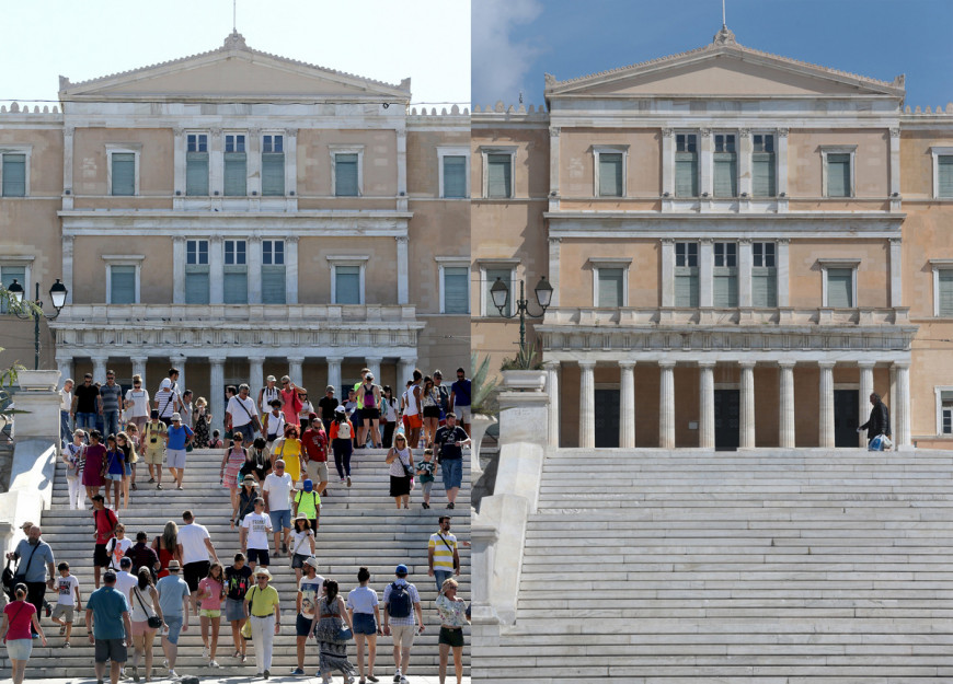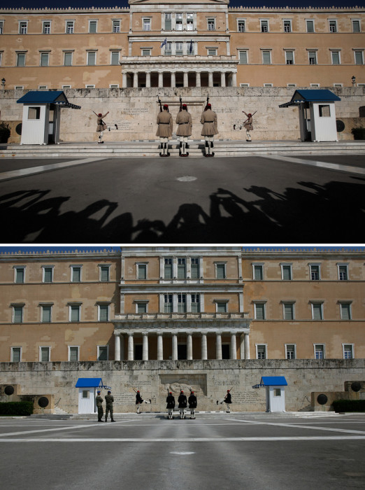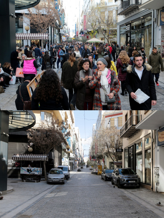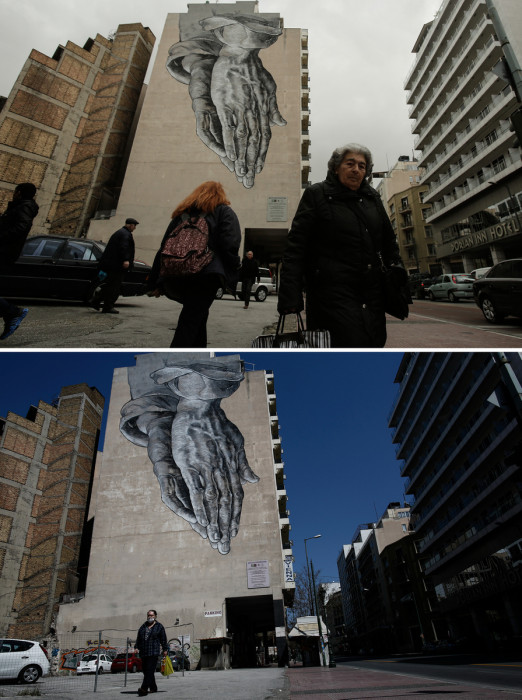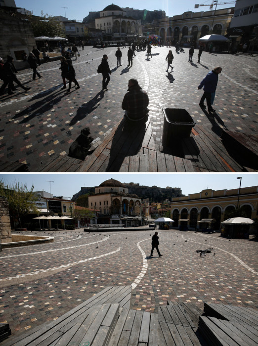 Φτάνοντας στην πλατεία Συντάγματος το σιντριβάνι είναι η πρώτη φορά που ακούγεται τόσο καθαρά, την ίδια ώρα που κάποιοι άνθρωποι δίχως στέγη κοιμούνται στα παγκάκια. Οι Εύζωνες μπροστά από τη Βουλή δεν έχουν κοινό να παρακολουθήσει την αλλαγή φρουράς, που άλλοτε αυτή την περίοδο συγκέντρωνε τα βλέμματα τουριστών και όχι μόνο. Διασχίζοντας τον πιο εμπορικό δρόμο του κέντρου της Αθήνας, την Ερμού, η εικόνα θυμίζει Δεκαπενταύγουστο. Κλειστές βιτρίνες καταστημάτων, που λίγο πριν το Πάσχα θα ήταν γεμάτα από κόσμο, ο οποίος θα έκανε τα ψώνια του για τις ημέρες των γιορτών. Σε μια βιτρίνα υπάρχει η πινακίδα «είμαστε κλειστά, μένουμε σπίτι, για το καλό όλων μας», υπενθυμίζοντας για ακόμη μία φορά την κατάσταση που επικρατεί.