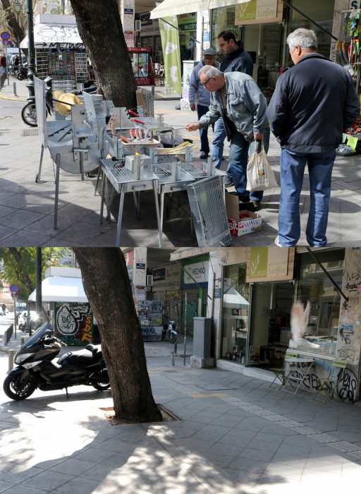 «Τα μόνα μαγαζιά που είμαστε ανοιχτά πάνω στη Σόλωνος είμαστε εμείς, ο φούρνος και το φωτοτυπείο. Κάθε μέρα μοιάζει σαν να είναι πέντε το πρωί του Σαββάτου», αναφέρει. Φτάνοντας στην Ακαδημίας ο ήχος από τις μηχανές των αστυνομικών κυριαρχεί στην ατμόσφαιρα, την ίδια ώρα που οι τζακαράντες (τα δέντρα με τα μοβ άνθη που υπάρχουν στο κέντρο της Αθήνας), έχουν ανθίσει και ομορφαίνουν τα πεζοδρόμια. Έξω από το Κέντρο Υγείας στην Ακαδημίας στέκεται κόσμος κρατώντας τις αποστάσεις μέχρι να τους φωνάξουν για να μπει ένας-ένας. Διασχίζοντας την Ακαδημίας, σε μια βιτρίνα στο ύψος της οδού Αμερικής έχει κολληθεί ένα χαρτί που γράφει: «Αγαπητοί πελάτες θα θέλαμε να σας ενημερώσουμε ότι η λειτουργία μας αναστέλλεται λόγω κορονοϊού». Λίγο πιο πέρα η Πλατεία Κολωνακίου, ίσως, δεν έχει υπάρξει πιο ήρεμη. Μία κοπέλα έχει βγάλει τον σκύλο της βόλτα, ενώ απέναντι ένας άστεγος άντρας είναι ξαπλωμένος στο πεζοδρόμιο, σκεπασμένος με έναν υπνόσακο. Διαβάζει εφημερίδα και έχει αφήσει ένα ποτήρι πάνω στον υπνόσακο για όποιον θέλει να του προσφέρει βοήθεια.