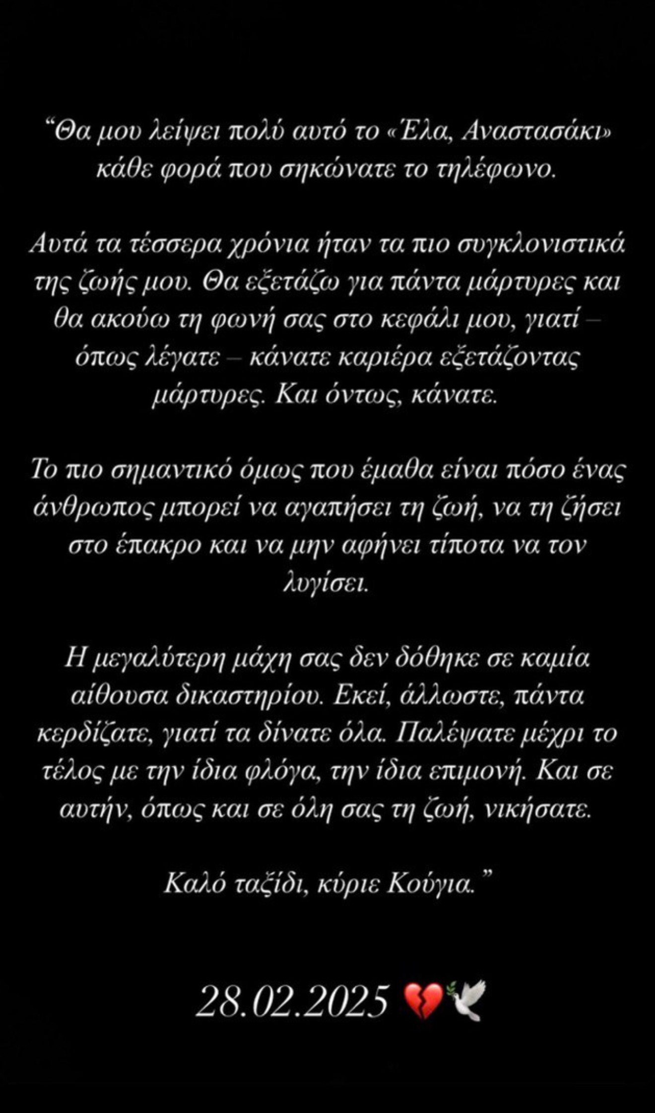 Δείτε παρακάτω την ανάρτηση της Αναστασίας Μπάκα μετά τον θάνατο του Αλέξη Κούγια.