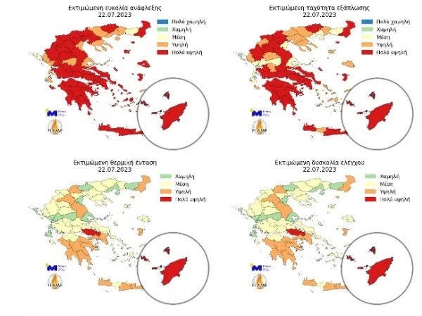 Επίσης ομάδα χαρτών αναδεικνύει τους λόγους της σημερινής της έκρηξης. Εκτιμώμενη ευφλεκτότητα, ταχύτητα εξάπλωσης, θερμική ένταση και δυσκολία ελέγχου ήταν σήμερα στο ανώτατο επίπεδο επικινδυνότητας.