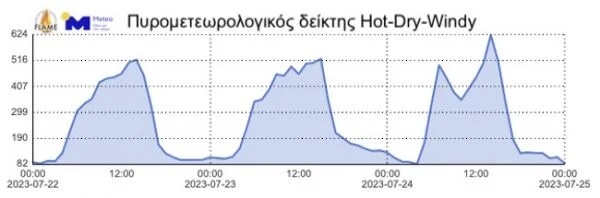 Σημαντικό είναι να τονιστεί ότι από τις πρώτες πρωινές ώρες έως τις μεσημβρινές ώρες της Κυριακής 23.07.2023, στο δυτικό μέτωπο της πυρκαγιάς αναμένεται πρόσκαιρη μεταβολή της διεύθυνσης του ανέμου σε βόρειους/βορειοανατολικούς, ενώ μετά τις μεσημβρινές ώρες αναμένουμε εκ νέου στροφή των ανέμων σε βόρειες/βορειοδυτικές διευθύνσεις. Οι πλέον δυσμενείς πυρομετεωρολογικές συνθήκες αναμένονται κατά τις θερμές ώρες (11:00 – 18:00) της Κυριακής 23.07.2023, οπότε και η ένταση των ανέμων θα αυξηθεί με την ευφλεκτότητα να είναι εξαιρετικά υψηλή (τιμές περιεχόμενης υγρασίας κάτω του 7%).