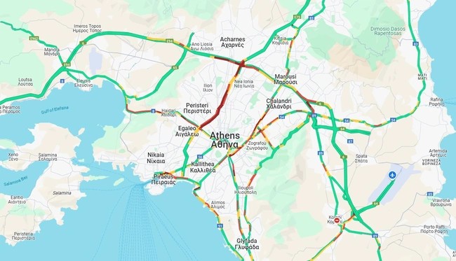 Σε ό,τι αφορά την κίνηση στους δρόμους, παρατηρείται μεγάλο μποτιλιάρισμα στον Κηφισό, στην άνοδο κυρίως από το Αιγάλεω και την Ιερά Οδό μέχρι την περιοχή της Νέας Φιλαδέλφειας.
