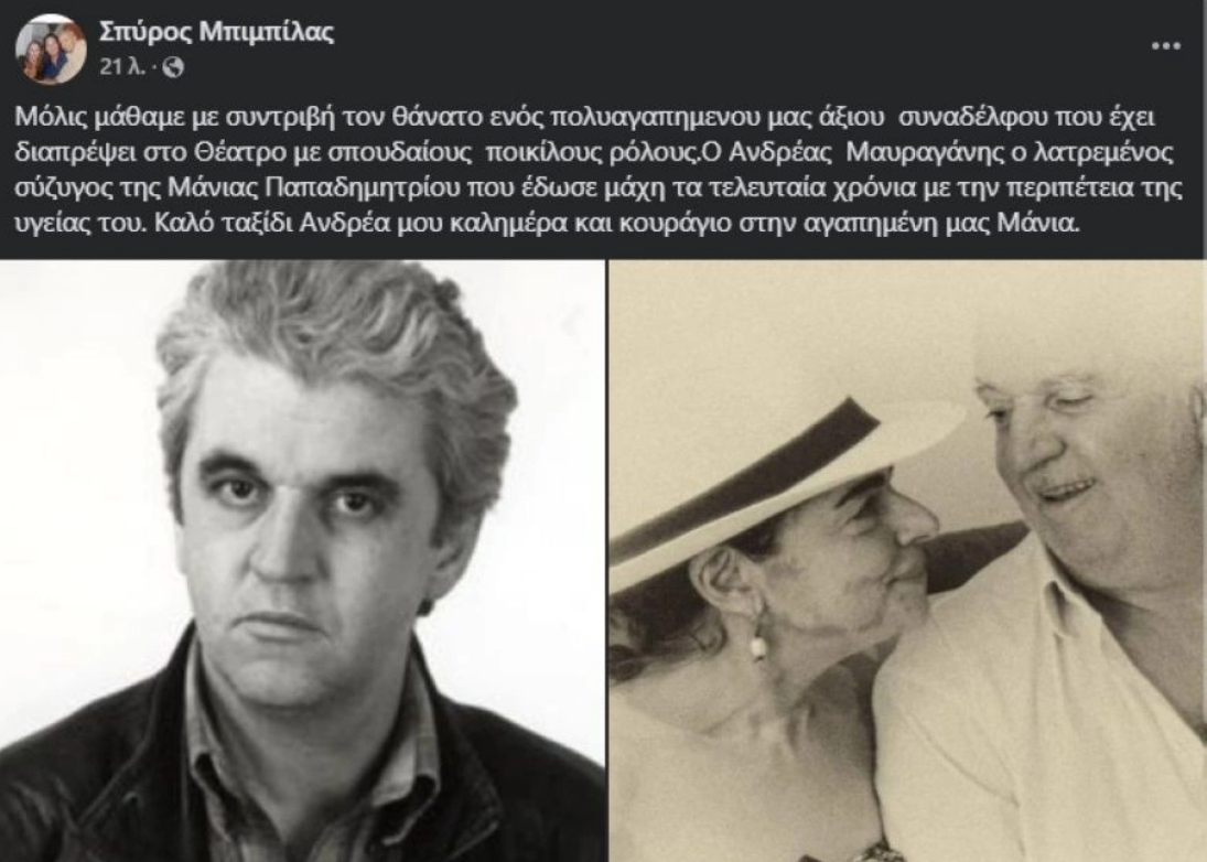 Στη συνέχεια, πρόσθεσε: «Ο Ανδρέας Μαυραγάνης, ο λατρεμένος σύζυγος της Μάνιας Παπαδημητρίου, που έδωσε μάχη τα τελευταία χρόνια με την περιπέτεια της υγείας του. Καλό ταξίδι Ανδρέα μου καλημέρα και κουράγιο στην αγαπημένη μας Μάνια».