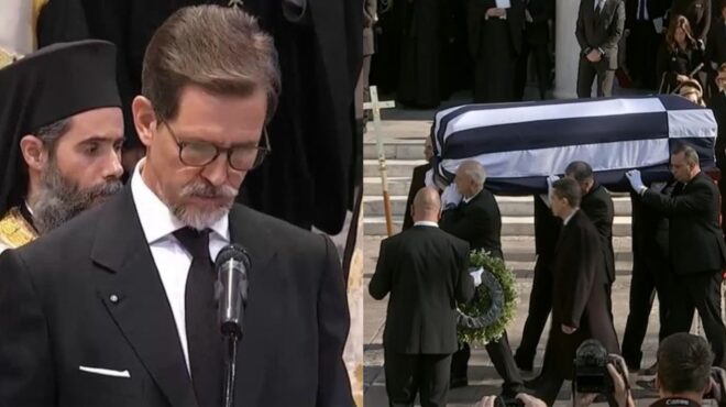 Φανερά συγκινημένος ο γιος του Παύλος εκφώνησε τον επικήδειο για τον πατέρα του και τέως βασιλιά Κωνσταντίνο, ενώ η Άννα Μαρία και τα υπόλοιπα μέλη της οικογένειας, τον κοιτούσαν συγκινημένοι.