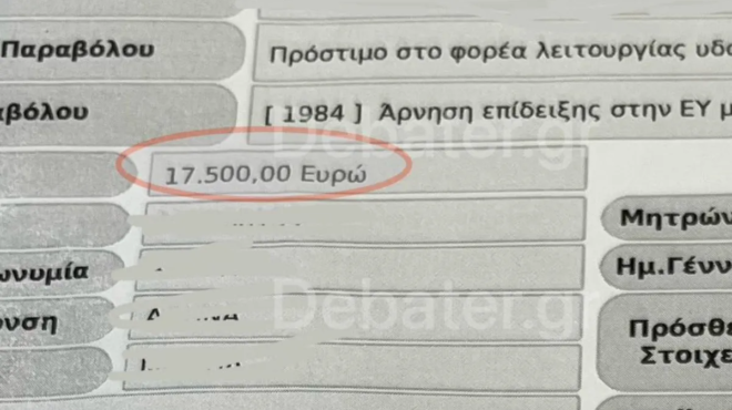 Όλα εξελίσσονταν ομαλά στη διαδικασία, όταν ήρθε η στιγμή της έκδοσης του ηλεκτρονικού παραβόλου των 10€. Ο υπάλληλος εκτύπωσε το ηλεκτρονικό παράβολο και έδωσε στην ανυποψίαστη γυναίκα τον κωδικό παραβόλου, αλλά το λάθος όπως βλέπετε στην εικόνα που εξασφάλισε το DEBATER ήταν ότι είχε κωδικό άλλου παραβόλου που αφορούσε κατηγορίας παραβόλου για «πρόστιμο στο φορέα Λειτουργίας υδατοδρομίου» (!)